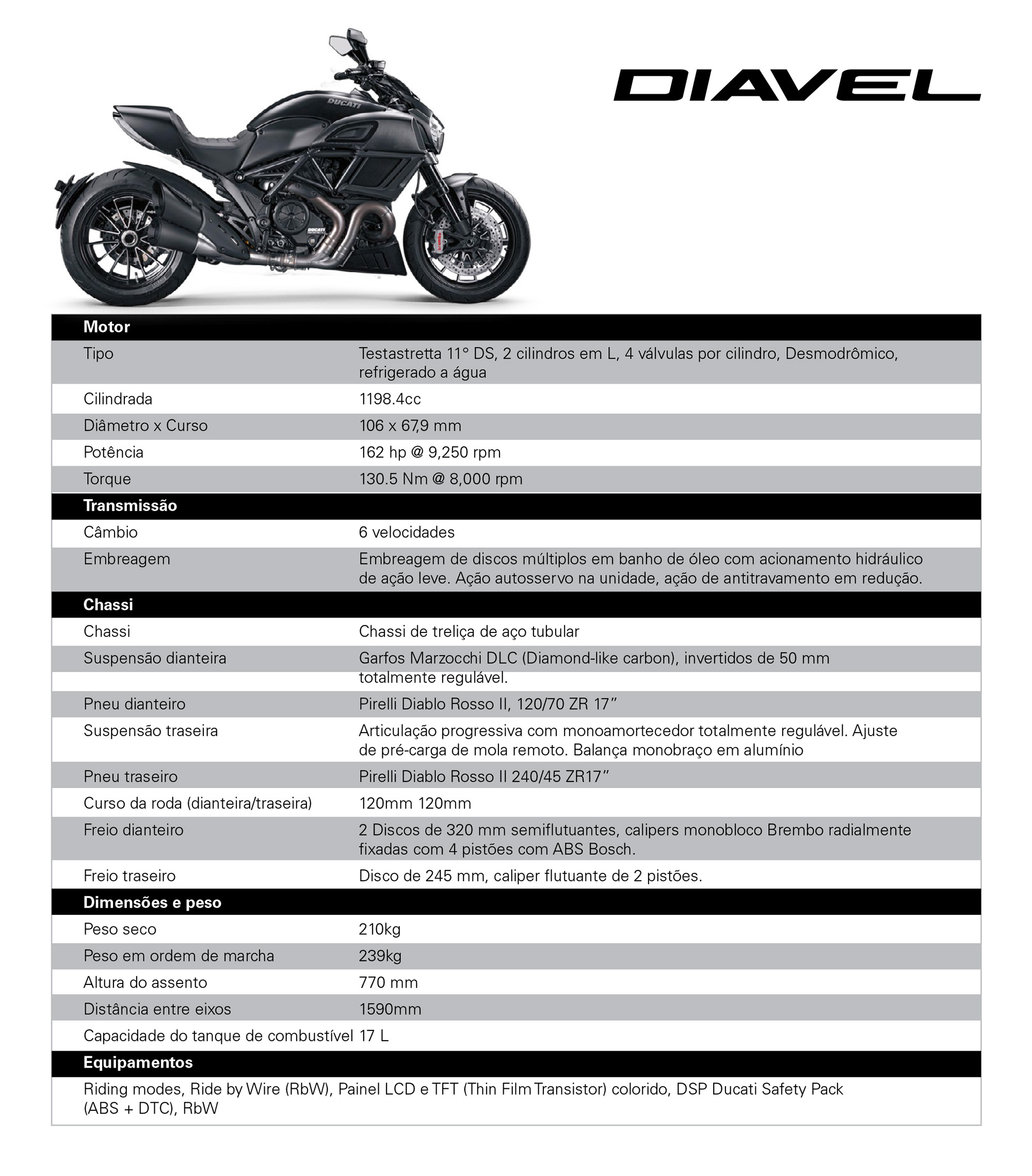 | EQUIPAMENTOS DE SEGURANÇA | Riding modes, Ducati Safety Pack (Bosch cornering ABS + DTC), DPL (Ducati Power Launch), RbW, Cruise control, Hands-free |